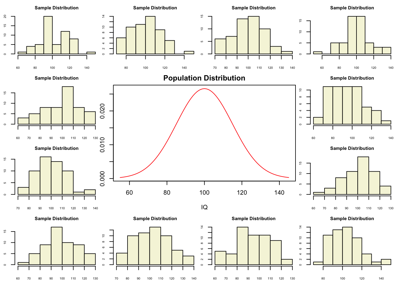 hist(rnorm(n, mu, sigma), main="Sample Distribution", cex.axis=.5, col="beige", cex.main = .75)