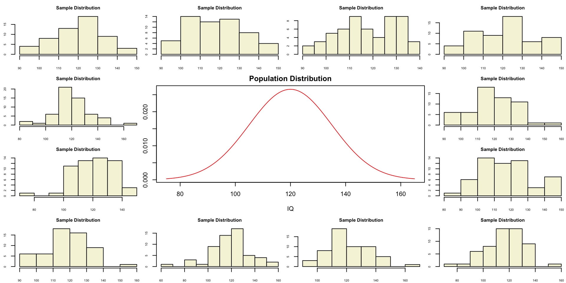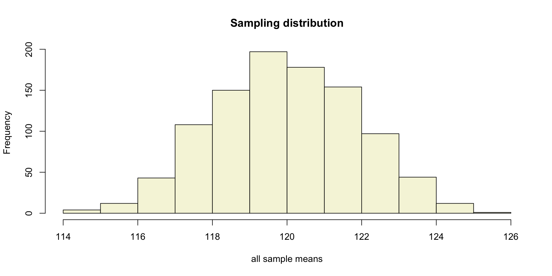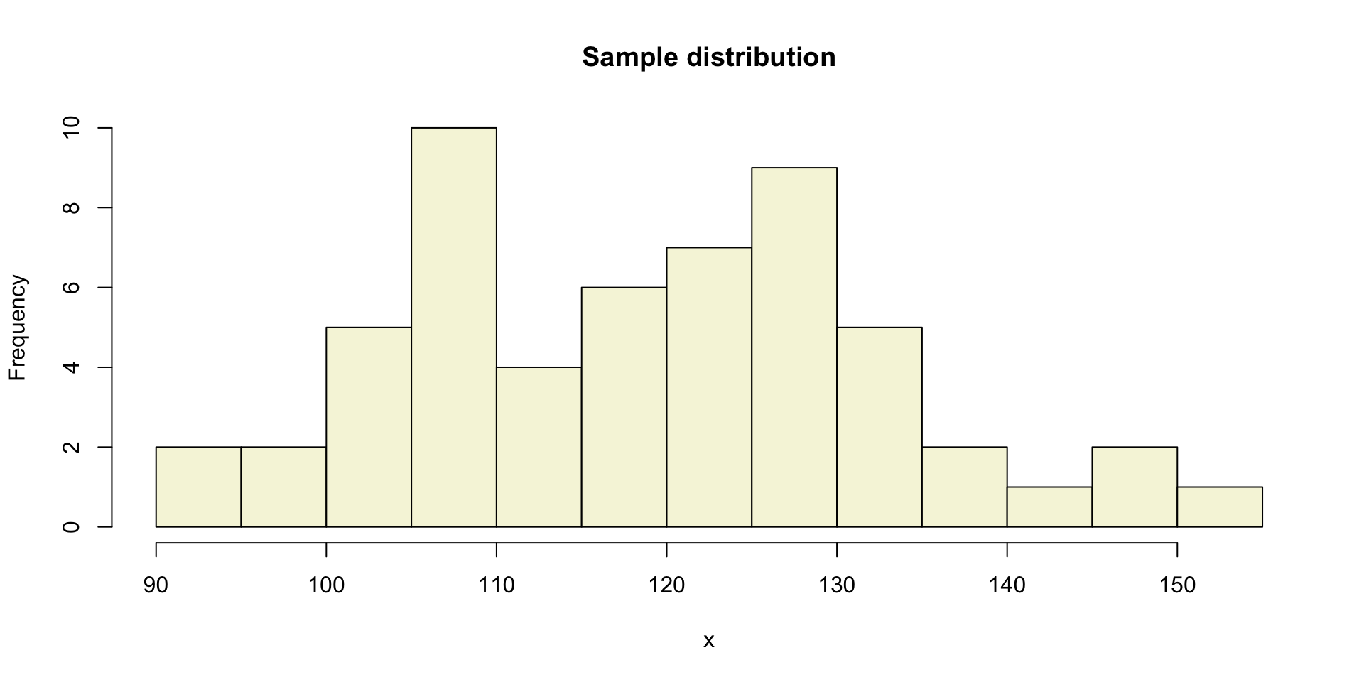 hist(rnorm(n, mu, sigma), main="Sample Distribution", cex.axis=.5, col="beige", cex.main = .75)