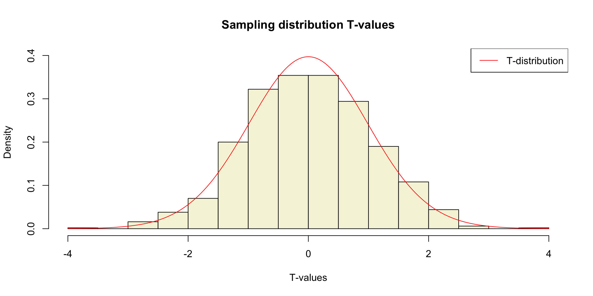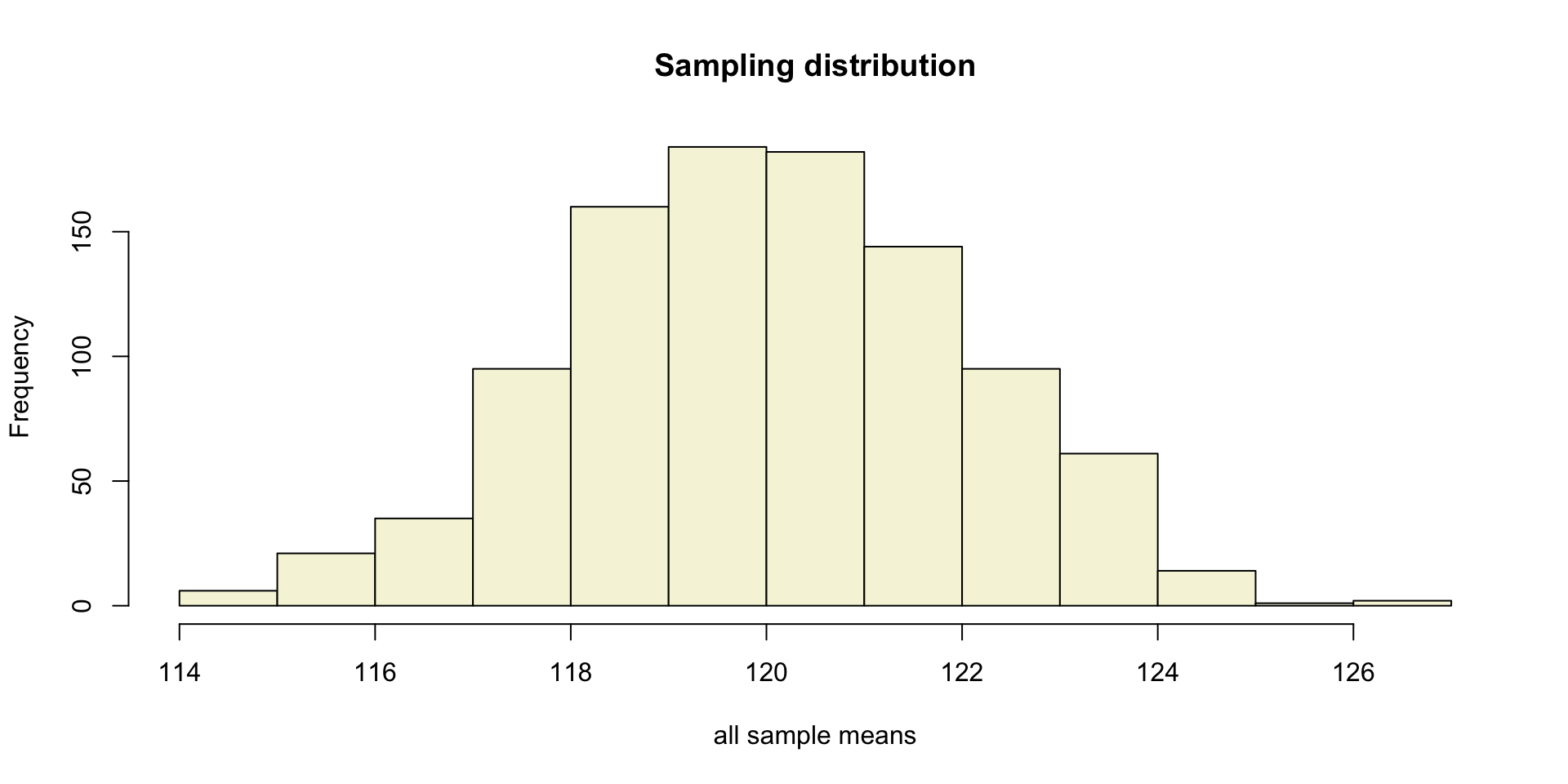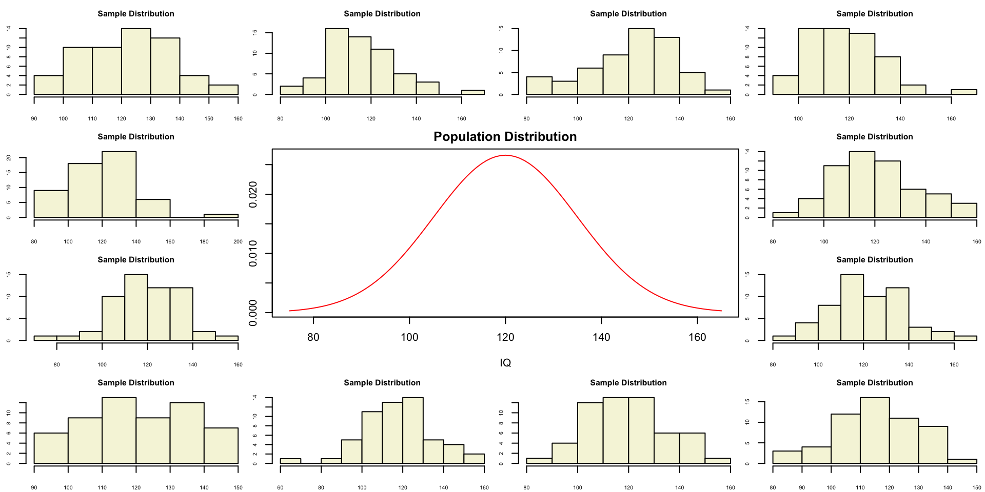 hist(rnorm(n, mu, sigma), main="Sample Distribution", cex.axis=.5, col="beige", cex.main = .75)