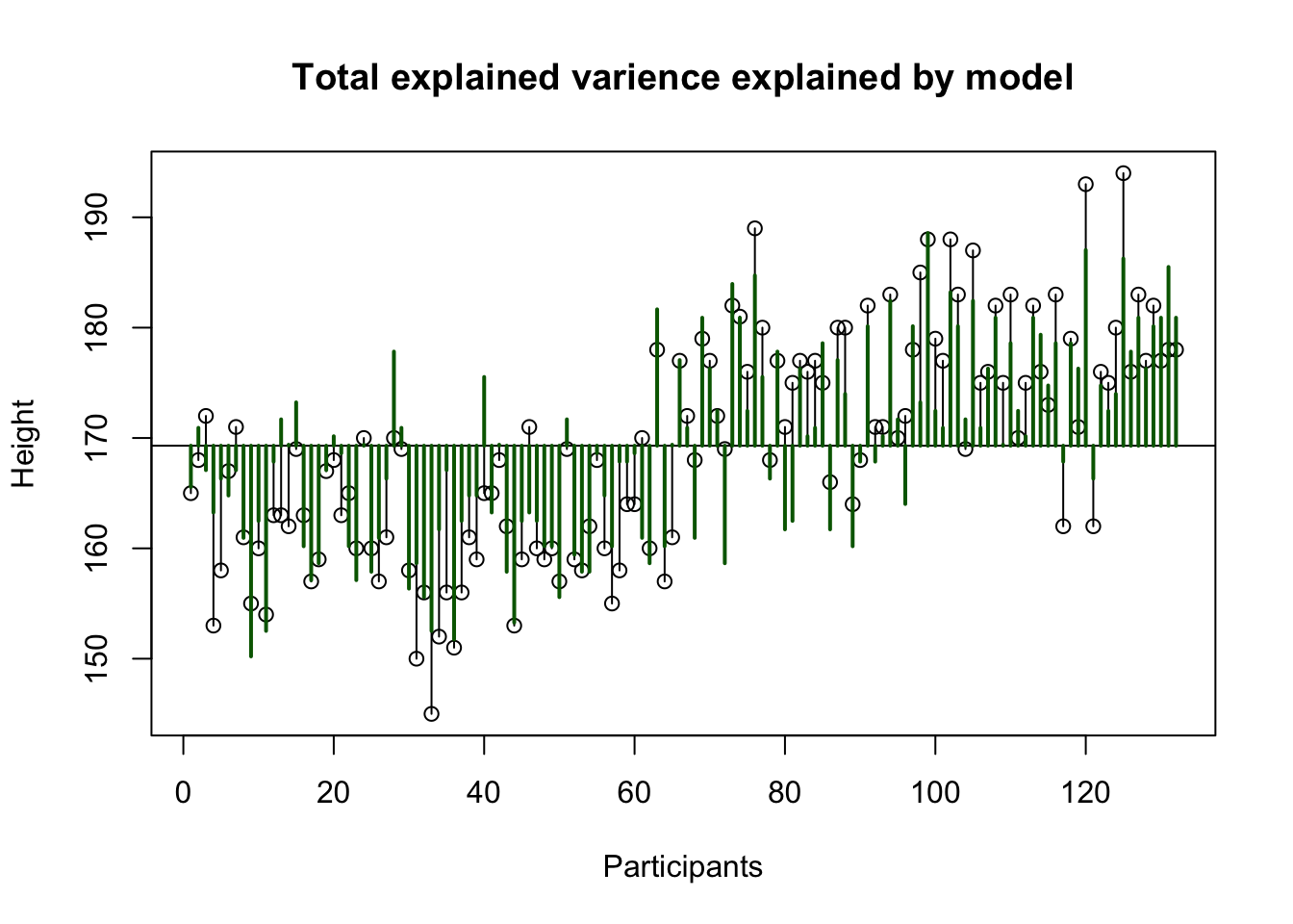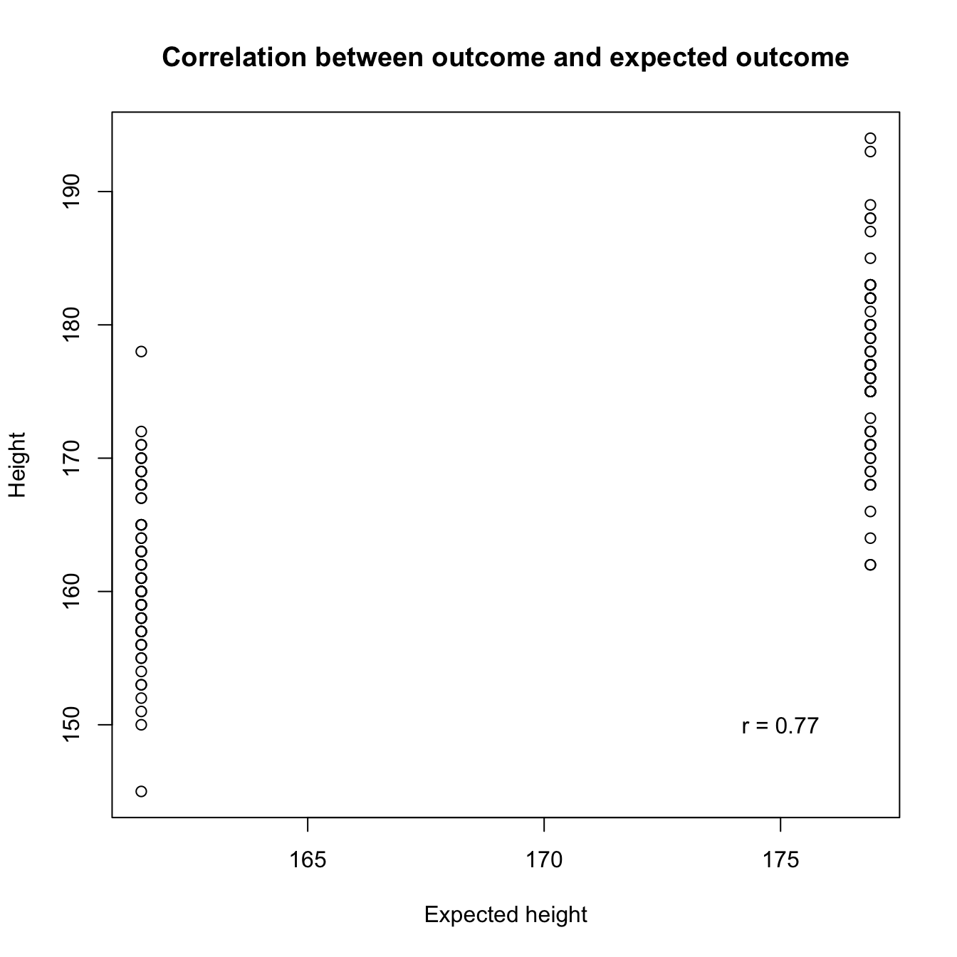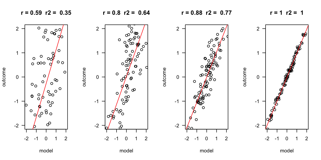 The better the model, the more it is the same as the outcome variable. Hence, they have a high correlation \(r\), and the explained variance \(R^2\) is also high.