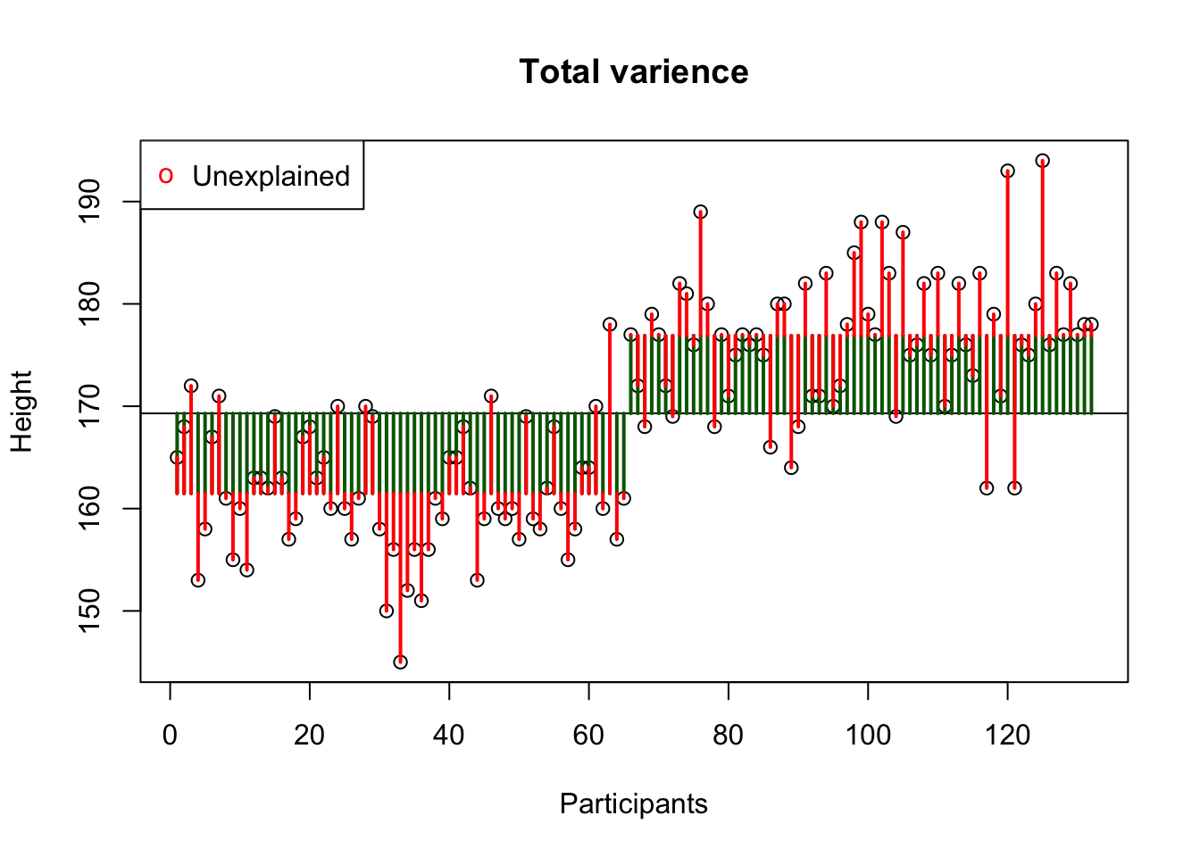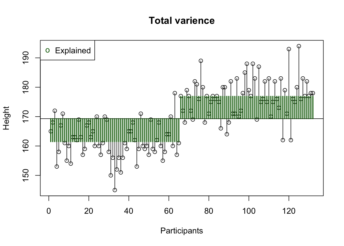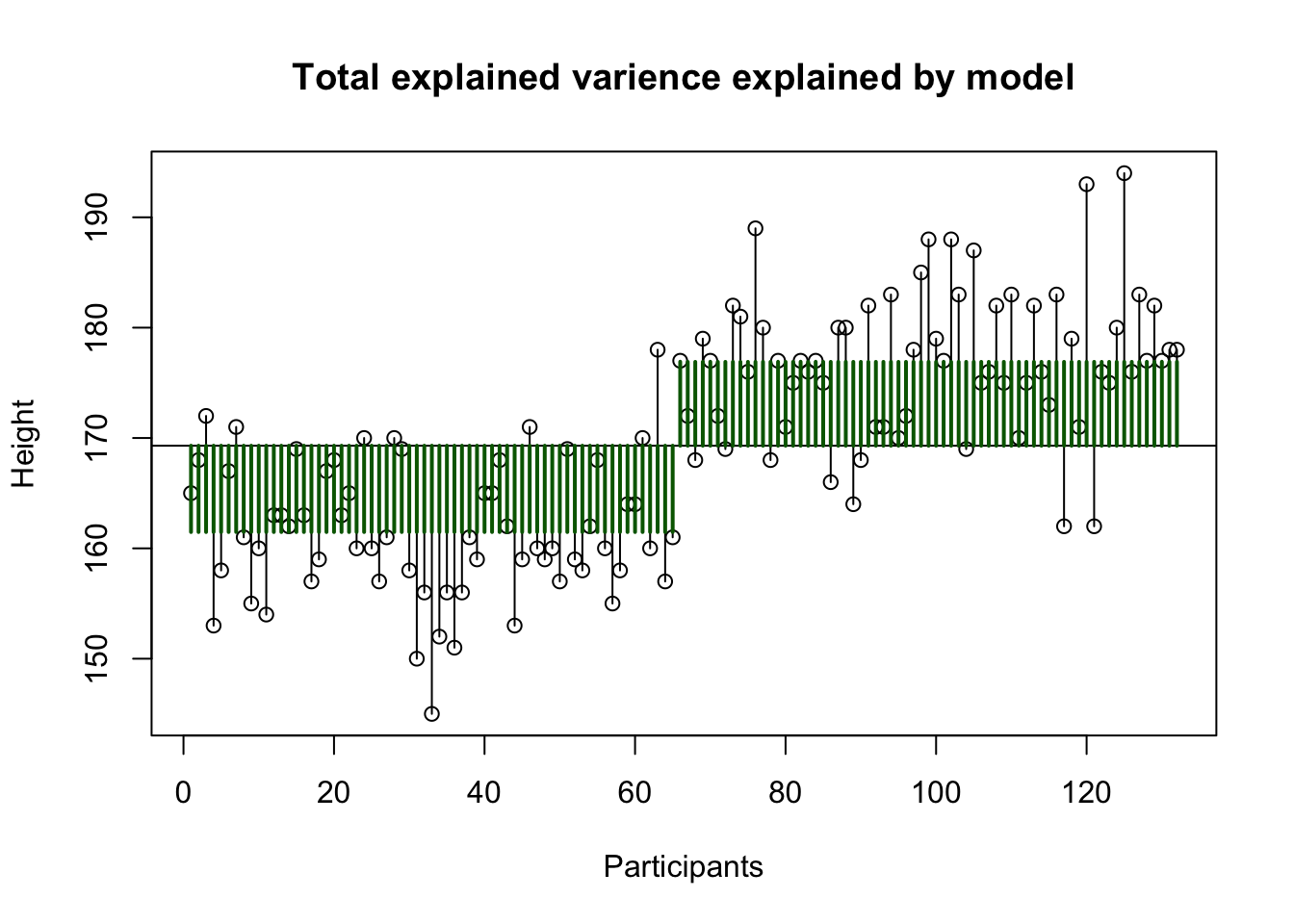 \[ \begin{align} \widehat{\text{height}}_i &= b_0 + b_1 \times \text{dummy}_i \\ \widehat{\text{height}}_i &= 161.48 + 15.42 \times \text{dummy}_i \end{align} \]
