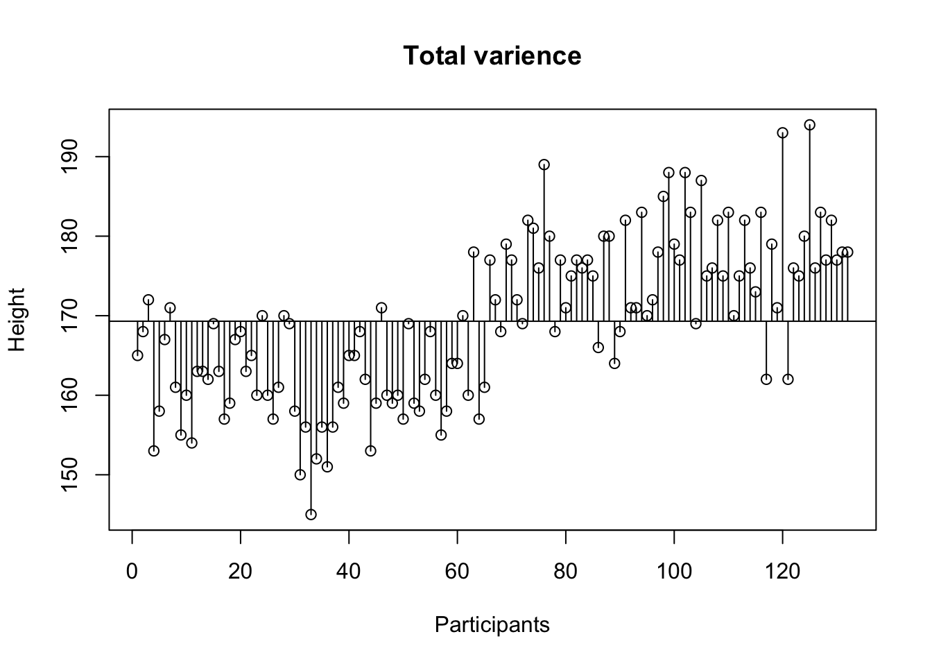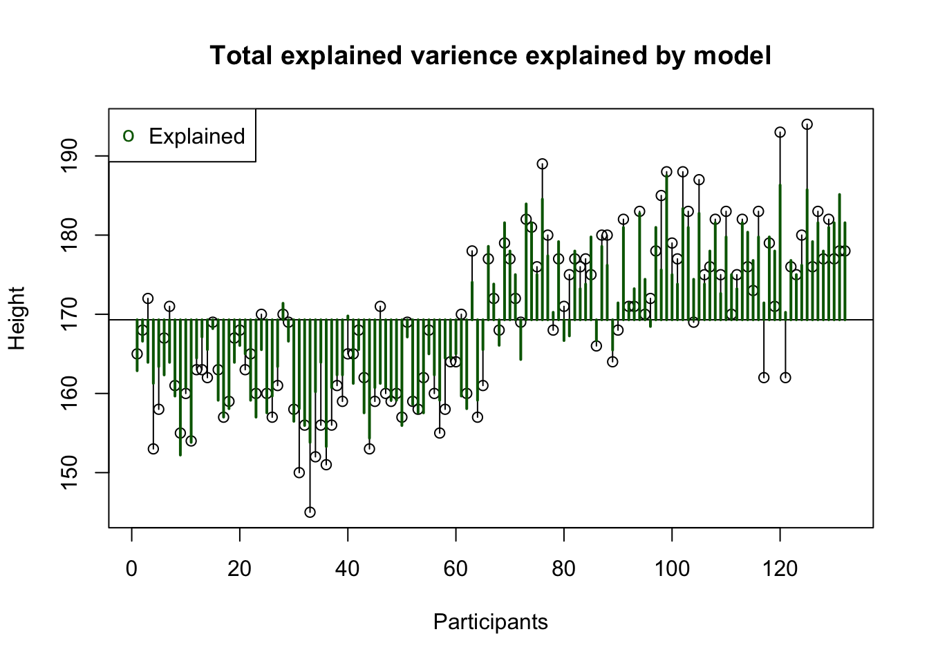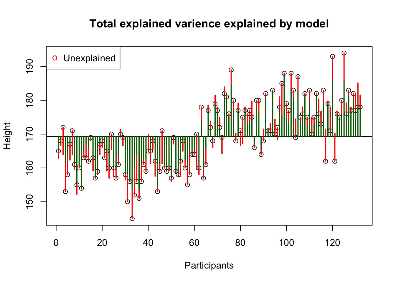 \[ \begin{align} \widehat{\text{height}}_i &= b_0 + b_1 \times \text{dummy}_i \\ \widehat{\text{height}}_i &= 161.48 + 15.42 \times \text{dummy}_i \end{align} \]