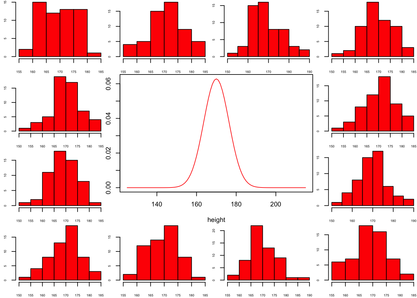 plot(height, dnorm(height, mean = mu, sd = sigma), type='l', col="red")