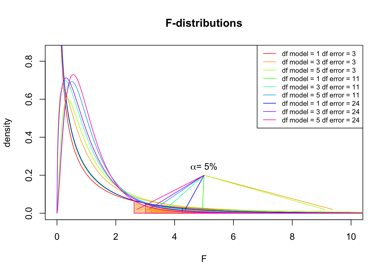 \(F = \frac{{MS}_{model}}{{MS}_{error}} = \frac{\text{between group var.}}{\text{within group var.}} = \frac{Explained}{Unexplained} = \frac{{SIGNAL}}{{NOISE}}\)