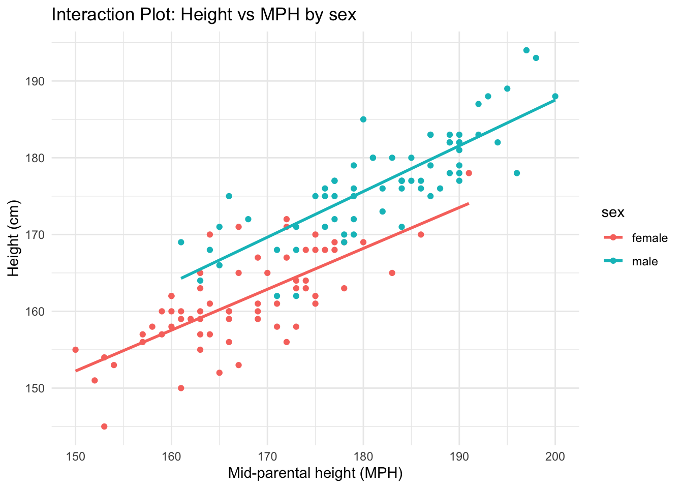\[ \begin{align} \widehat{height}_i &= b_0 + b_1 \times \text{male}_i + b_2 \times {MPH}_i + b_3 \times \text{male}_i \times {MPH}_i\\ \end{align} \]