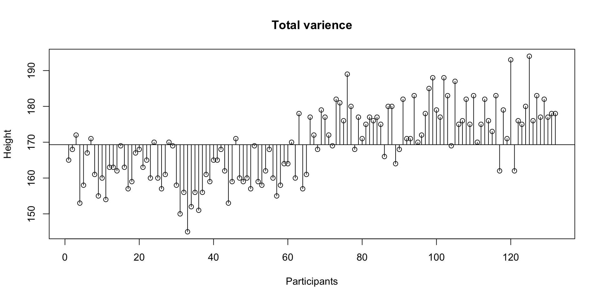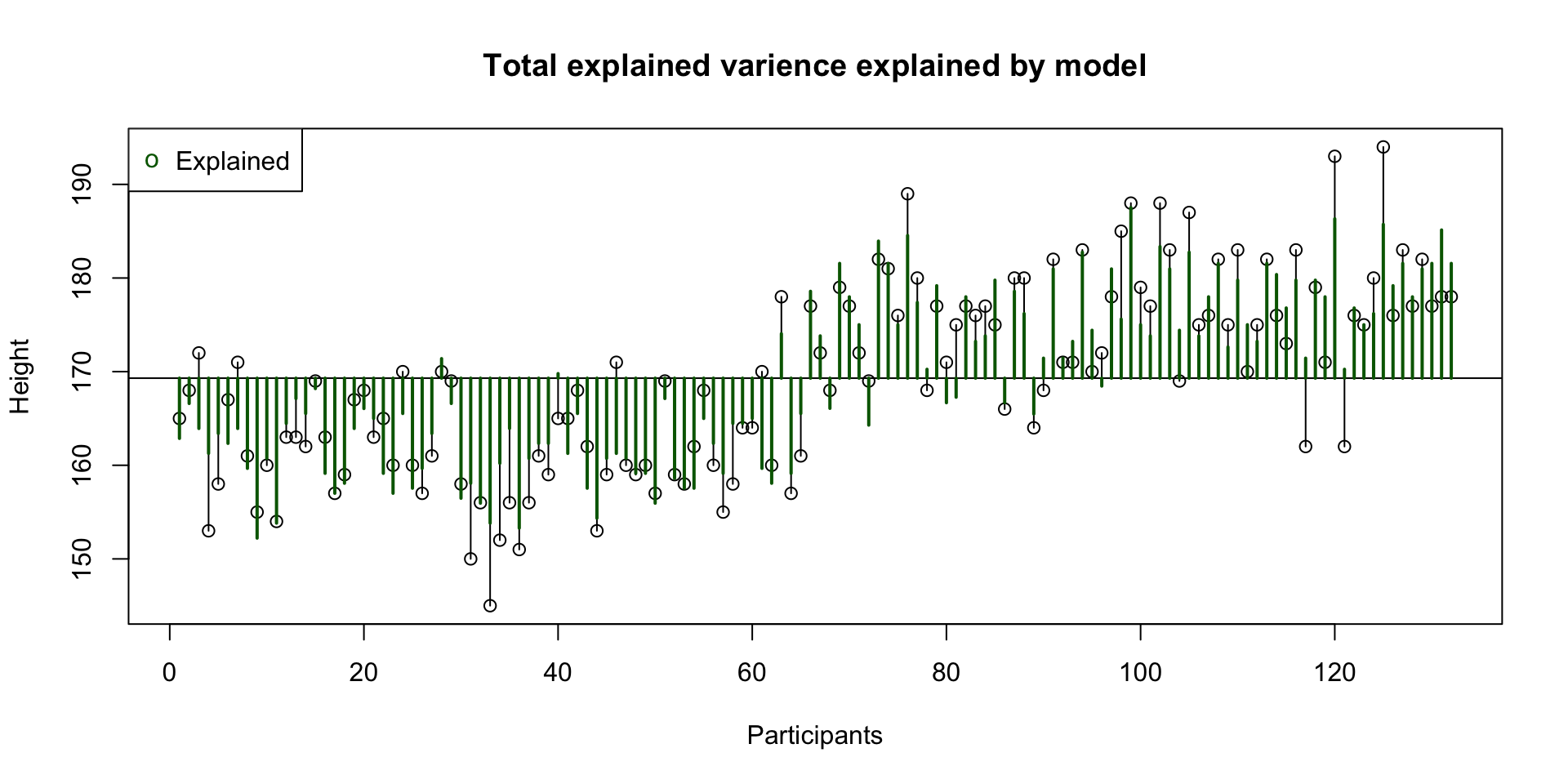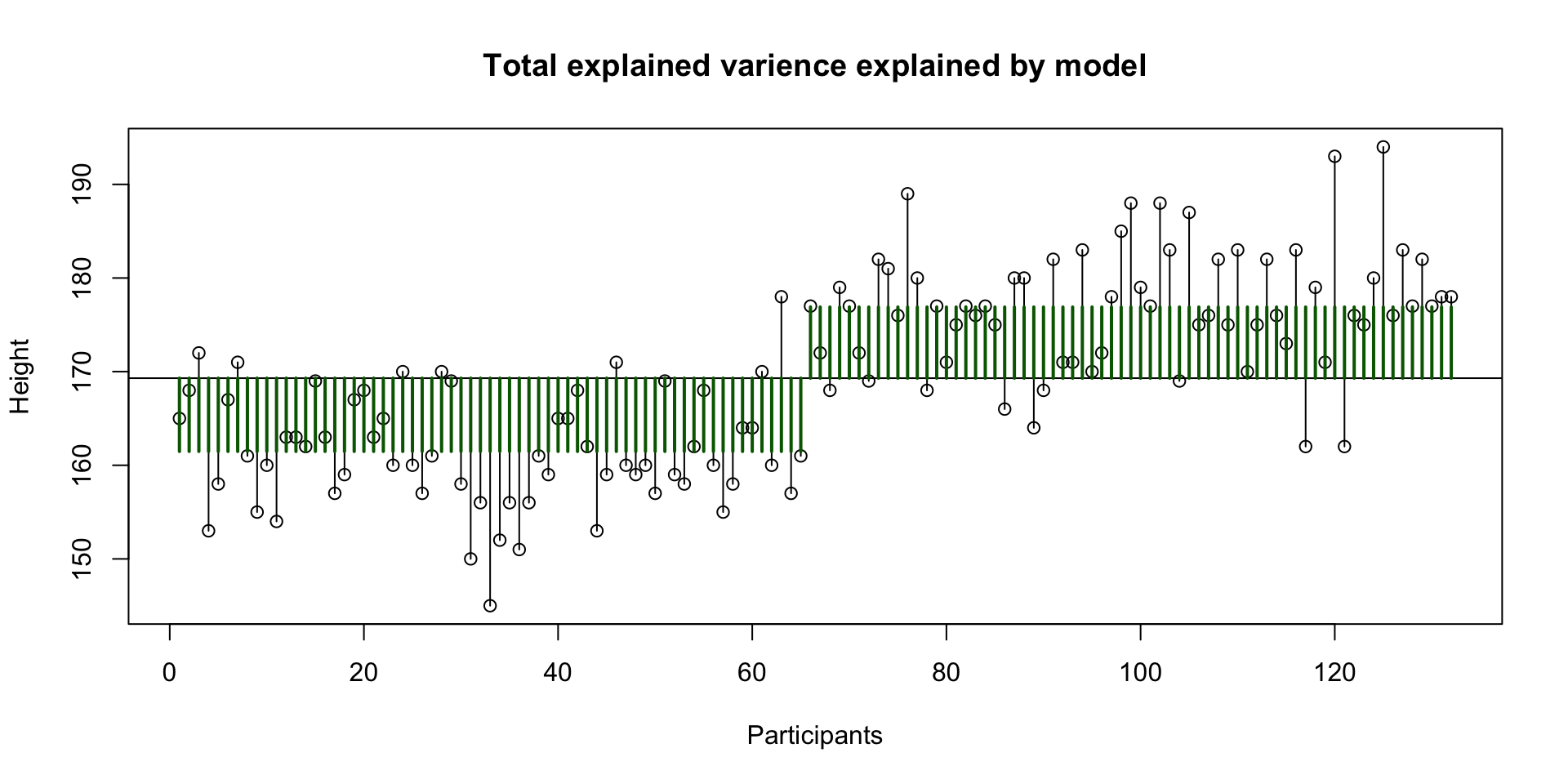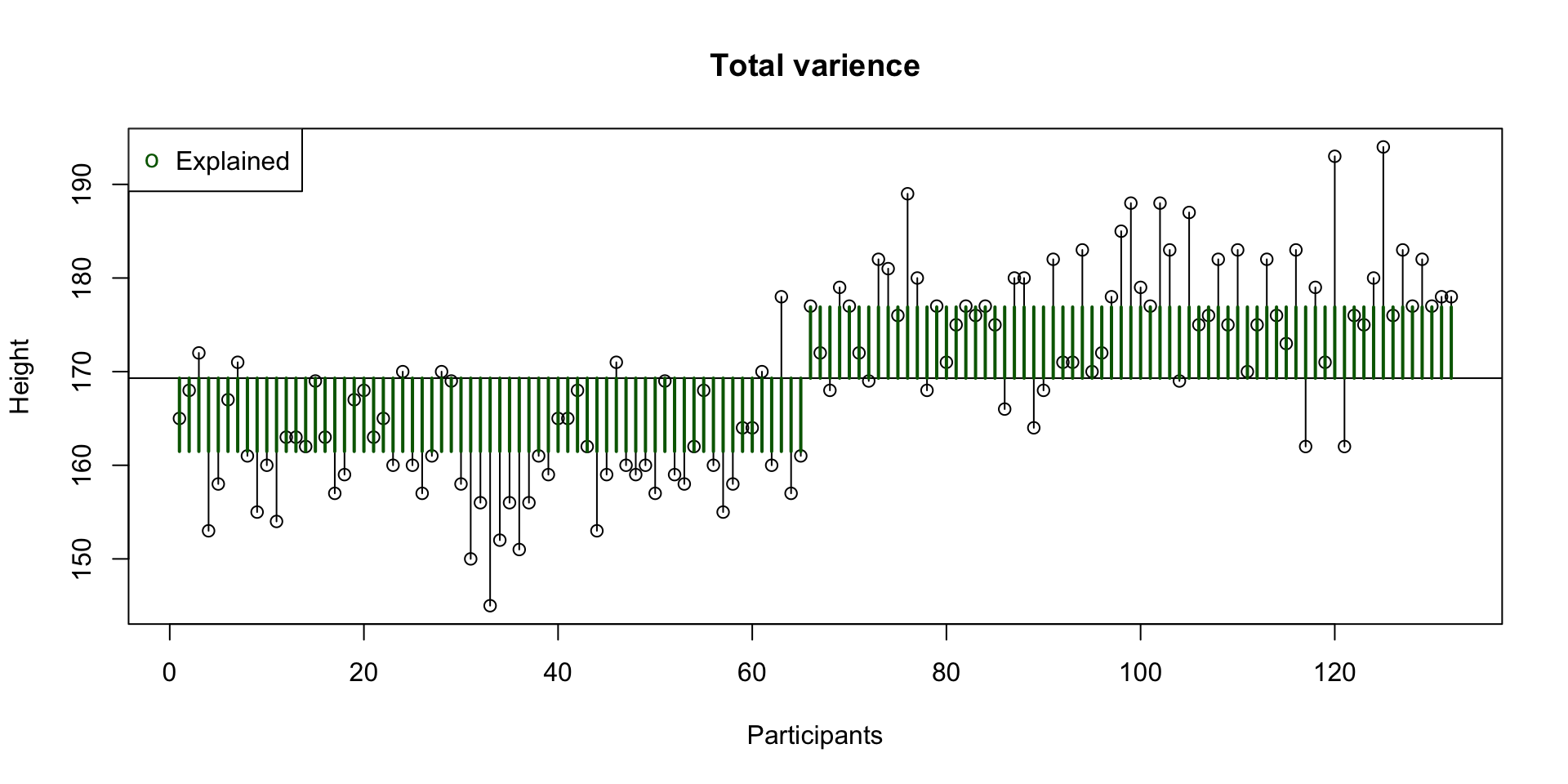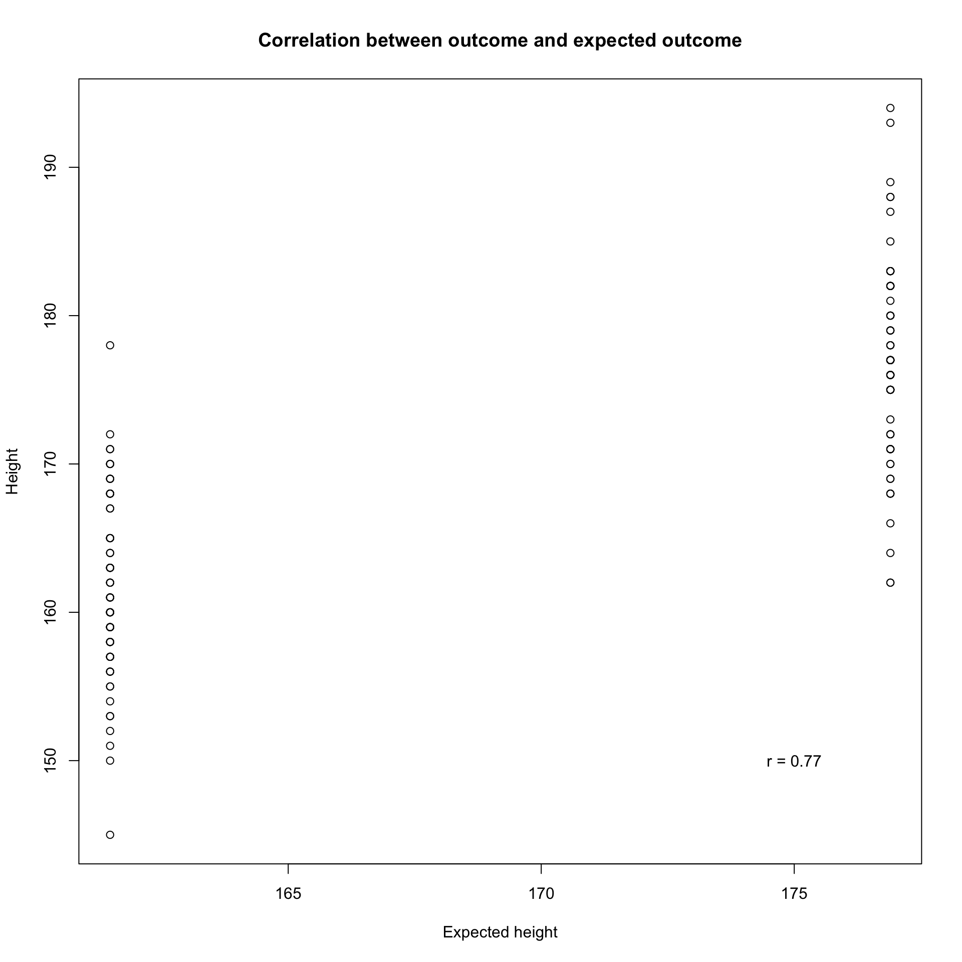\[ \begin{align} \widehat{\text{height}}_i &= b_0 + b_1 \times \text{dummy}_i \\ \widehat{\text{height}}_i &= 161.48 + 15.42 \times \text{dummy}_i \end{align} \]