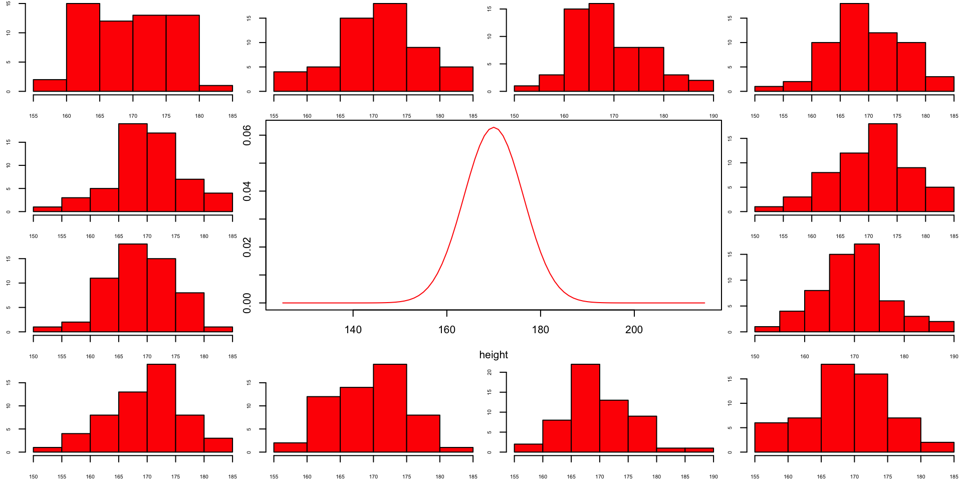 plot(height, dnorm(height, mean = mu, sd = sigma), type='l', col="red")