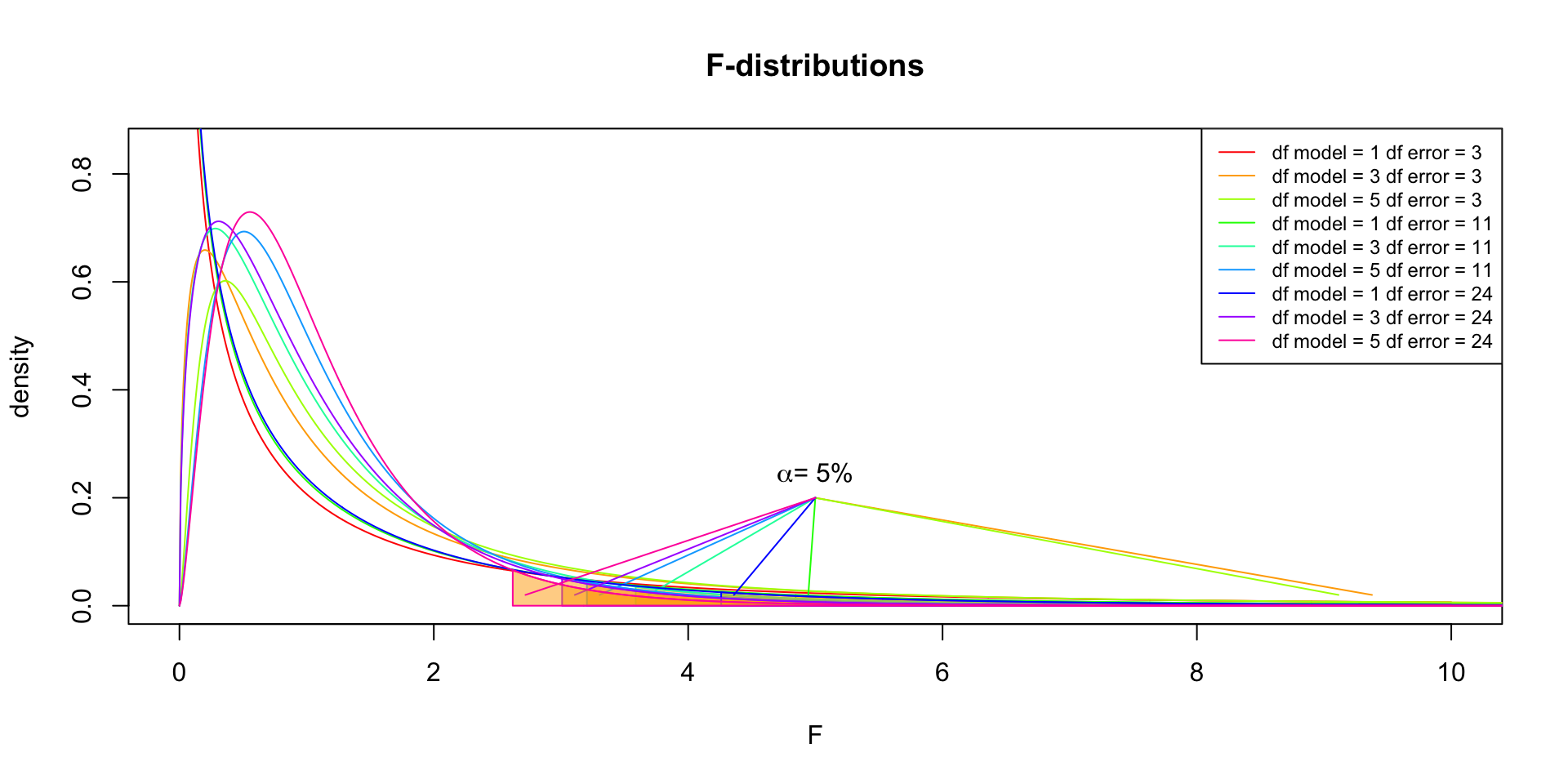 \(F = \frac{{MS}_{model}}{{MS}_{error}} = \frac{\text{between group var.}}{\text{within group var.}} = \frac{Explained}{Unexplained} = \frac{{SIGNAL}}{{NOISE}}\)
