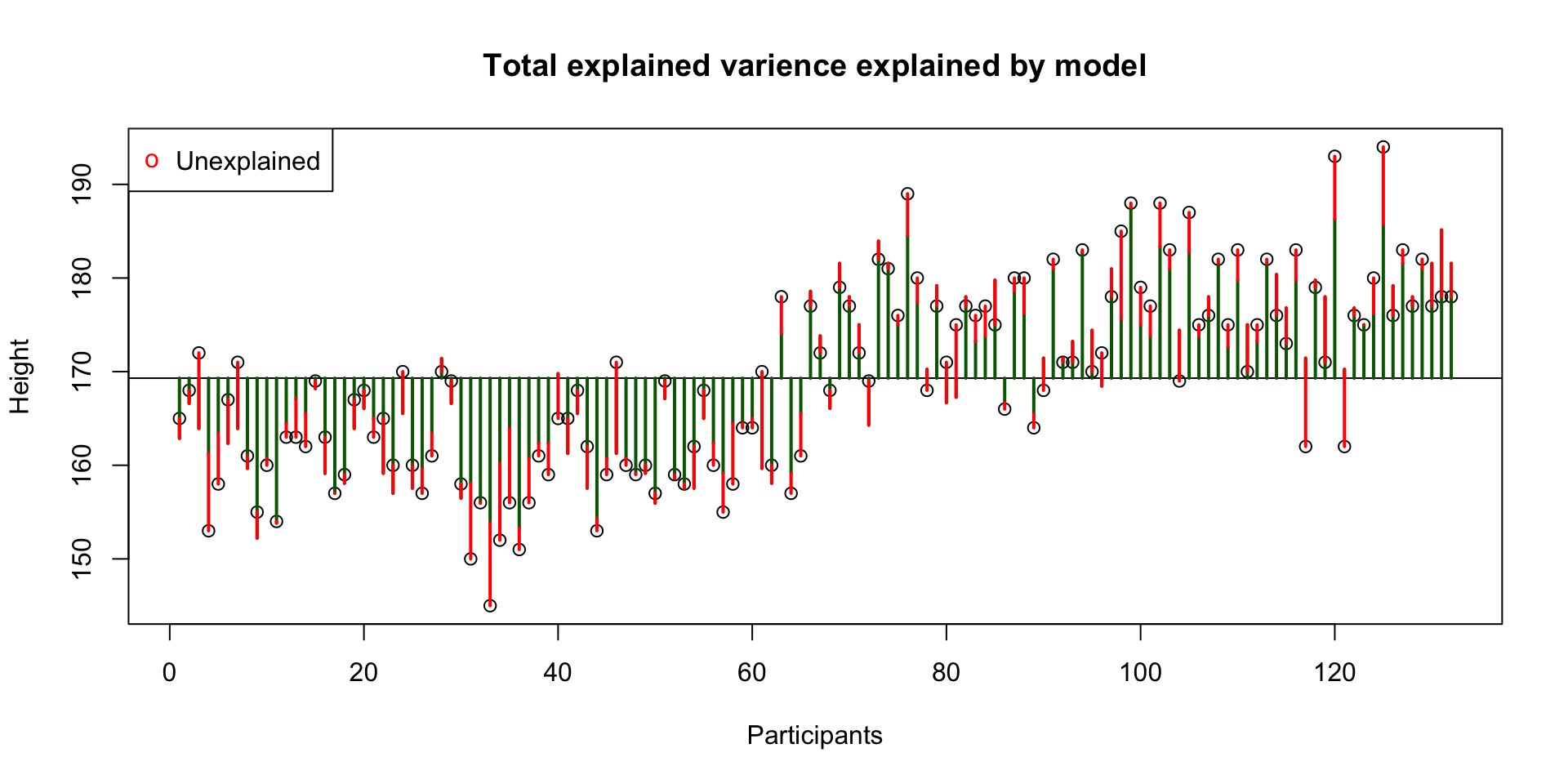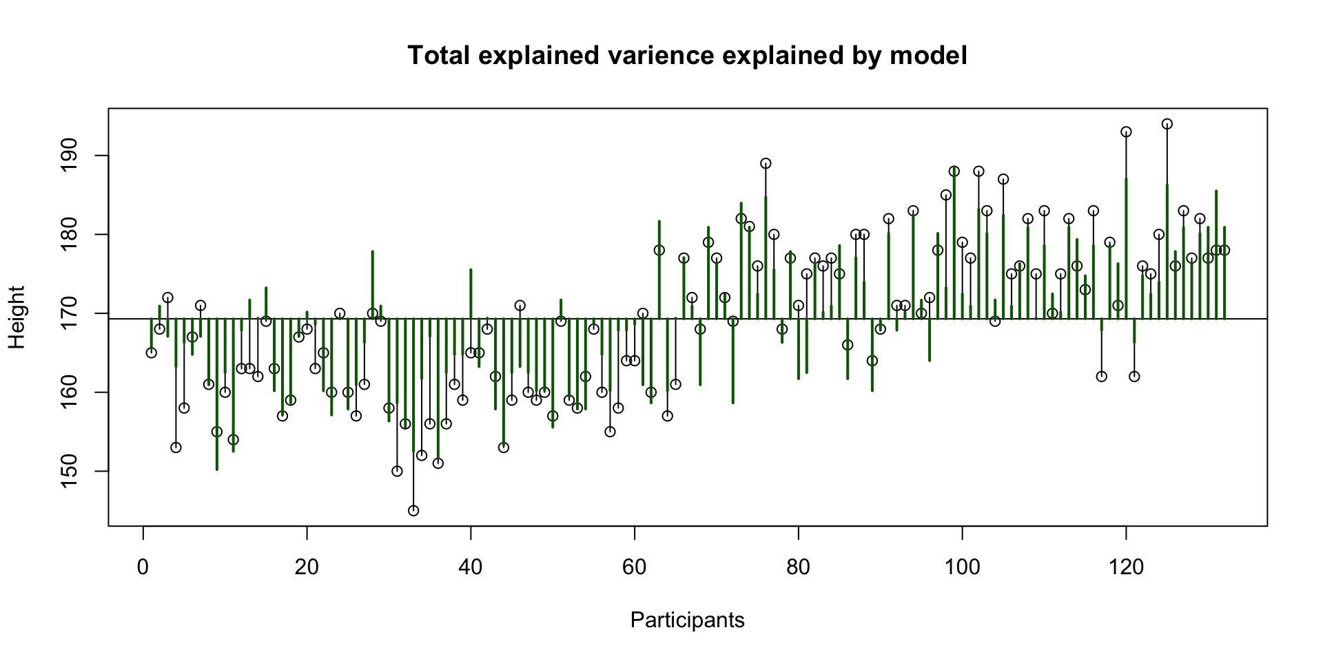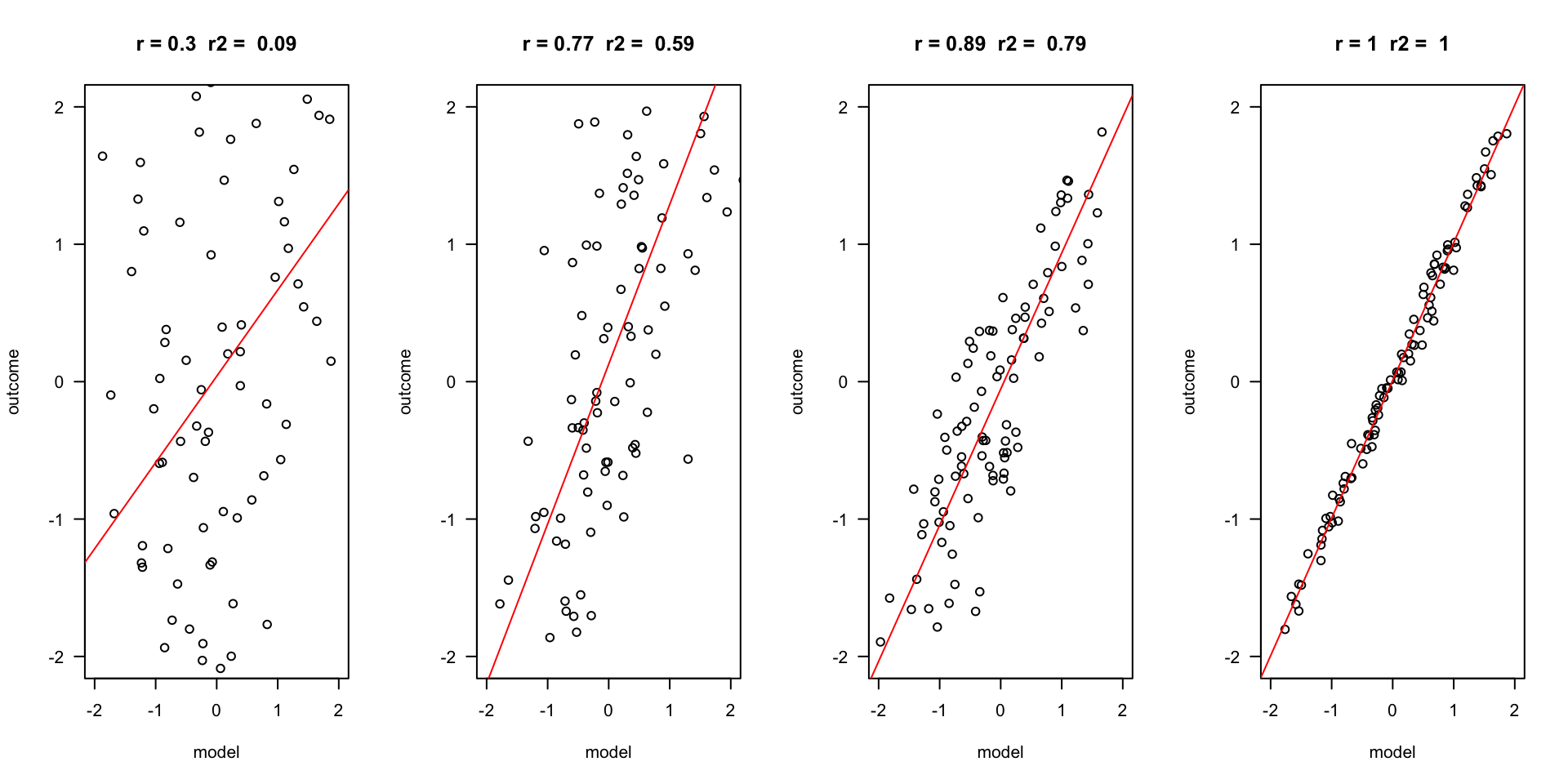 The better the model, the more it is the same as the outcome variable. Hence, they have a high correlation \(r\), and the explained variance \(R^2\) is also high.