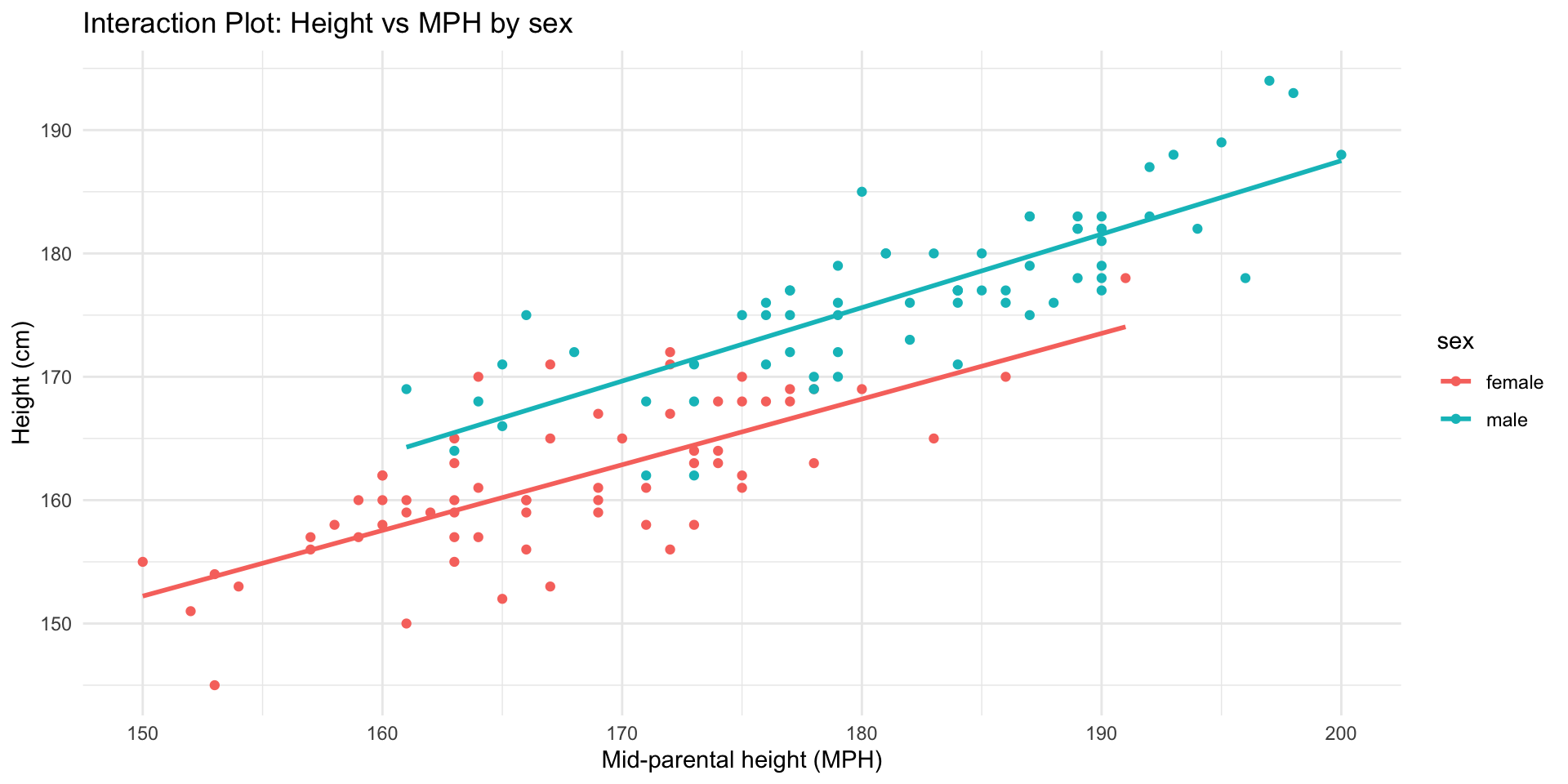 \[ \begin{align} \widehat{height}_i &= b_0 + b_1 \times \text{male}_i + b_2 \times {MPH}_i + b_3 \times \text{male}_i \times {MPH}_i\\ \end{align} \]